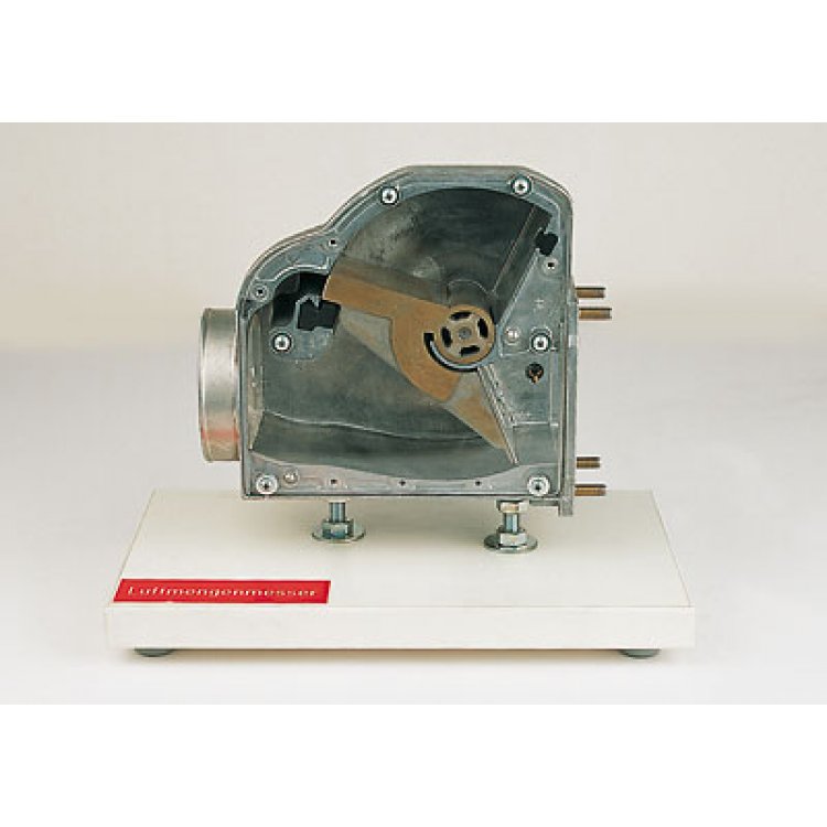Hinter der Plexiglaswand erkennt man deutlich die Stau- und Kompensationsklappe und kann diese hin- und herbewegen. Von hinten erkennt man den Potentiometer und den IC.